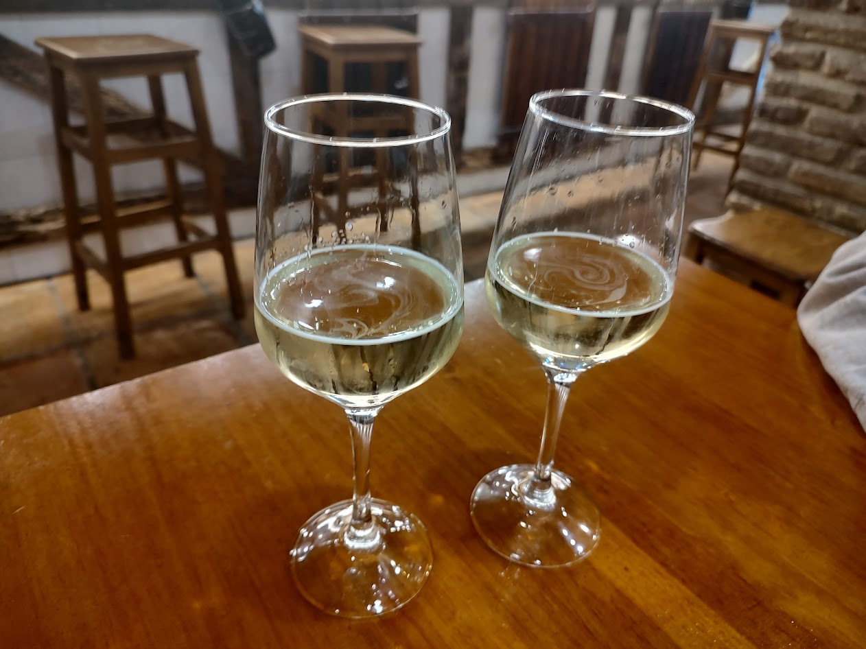 まずは飲み物。チャコリを注文。チャコリはこの地方特産の微発泡の白ワインでアルコール度数低め。どこの店でも、程度の差はあるが、このように高いところからグラスに注ぐ。こうすることで炭酸をある程度抜くという話もあるが、パフォーマンスなのかなと思う。